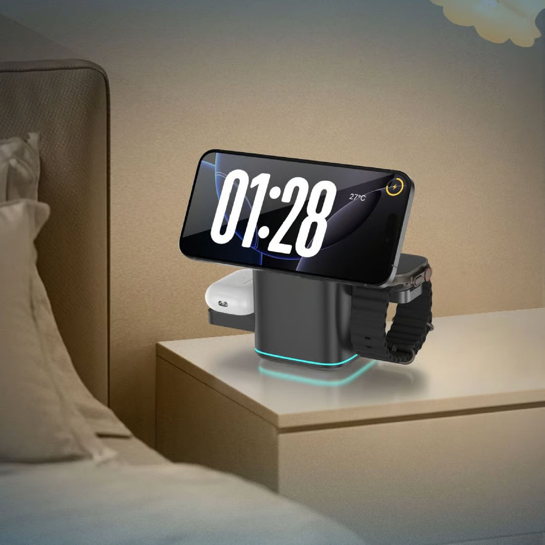 Effortlessly power your iPhone, Apple Watch, and AirPods with one sleek and compact station. Certified by Qi2 for safe, efficient fast charging, this foldable pop-up design is perfect for both travel and desk use. Features include intelligent touch-activated charging, independent charging arms for each device, and a minimalist design that complements any space.